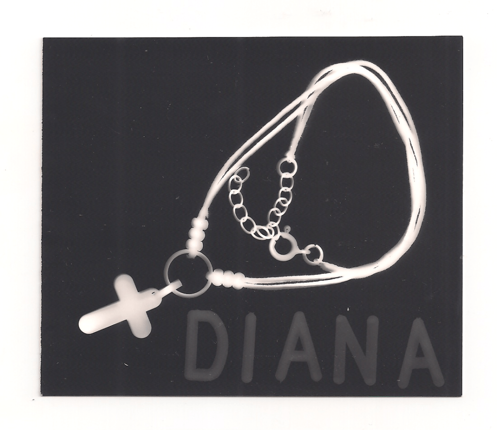Na imagem colocada aqui ao lado, coloquei o papel fotográfico no ampliador, coloquei o meu colar e escrevi o meu nome em letras pequenas que uma colega levou para a aula. A imagem foi exposta durante 4 segundos.