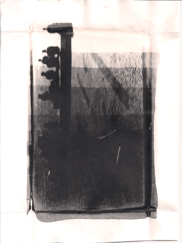 Na aula seguinte, usámos película de analógico fotografada numa aula de Técnicas Fotográficas. Fizemos testes de exposição com auxílio de um ampliador fotográfico . Cobrimos parte da folha com uma cartolina preta e expomos durante alguns segundos, movendo a cartolina pouco a pouco.