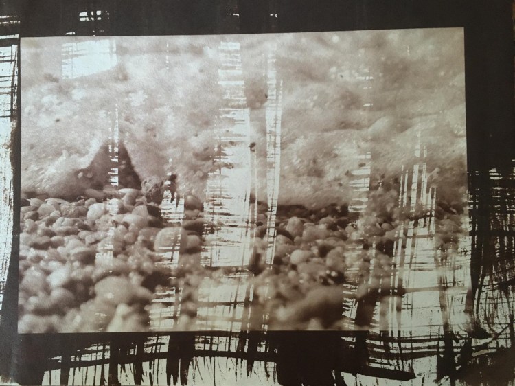 Após o nosso primeiro contacto com este processo, tivemos a oportunidade de experimentar com outros suportes. O meu grupo usou como suporte um pedaço de pedra de mármore, que na aula anterior tinha sido preparada para receber a emulsão com 2 a 3 camadas de verniz em spray. Foi feito o mesmo numa folha de papel (usado na técnica do “barquinho”) para fazer testes de tempo.